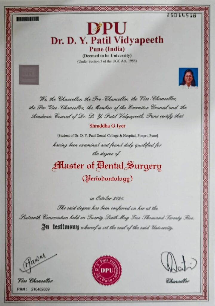 Constantly updating herself with the latest techniques and technology, Dr. Shraddha blends precision with warmth — proving that dental care can be both high-quality and genuinely kind.